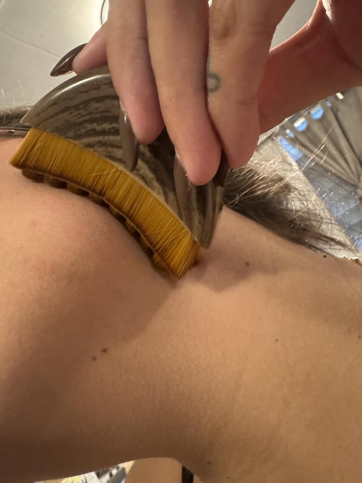 Use on clean, dry skin. With light, gentle strokes, brush from the center of your face outward toward your ears and down your neck. No pressure needed—let the bristles do the work. 2-3 minutes daily is all it takes.